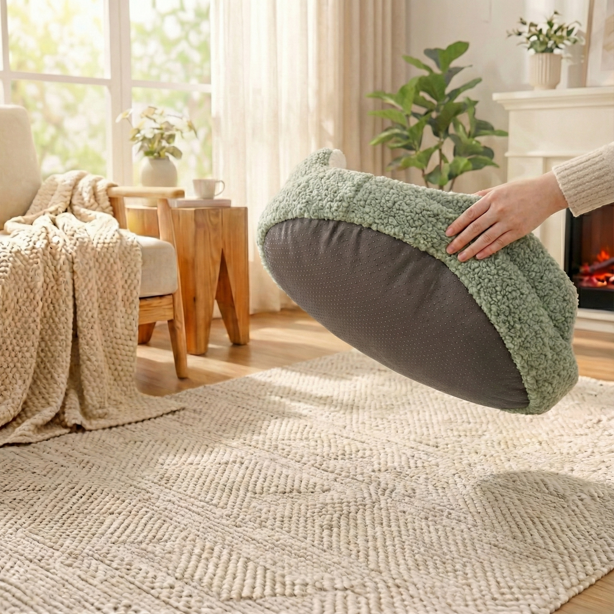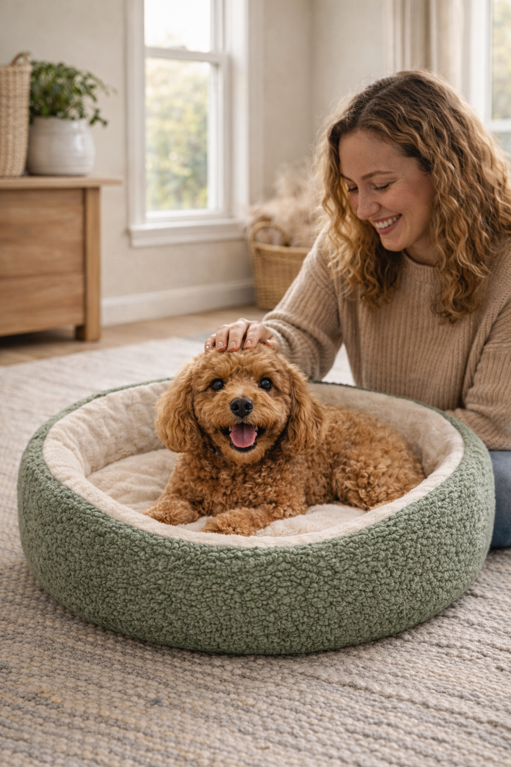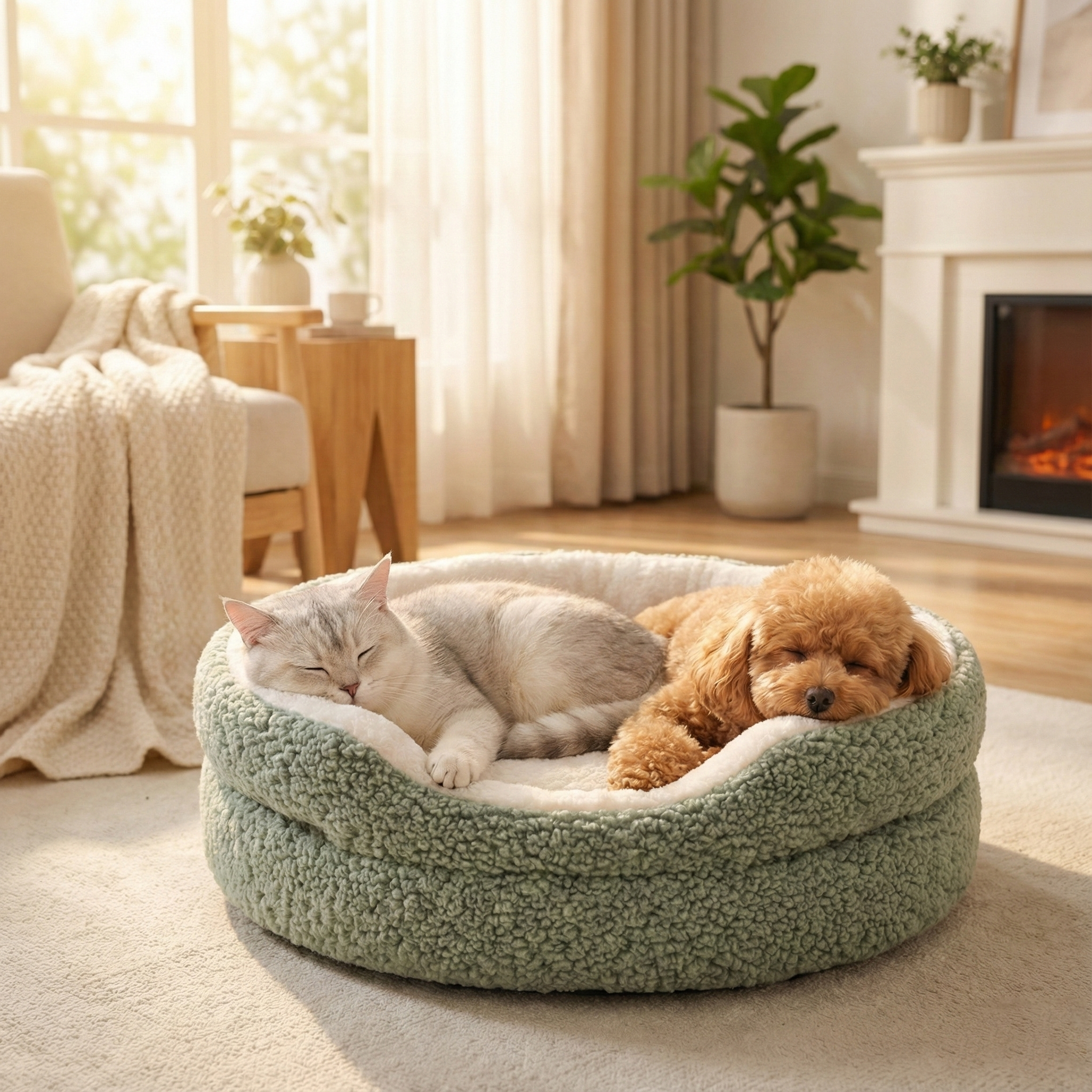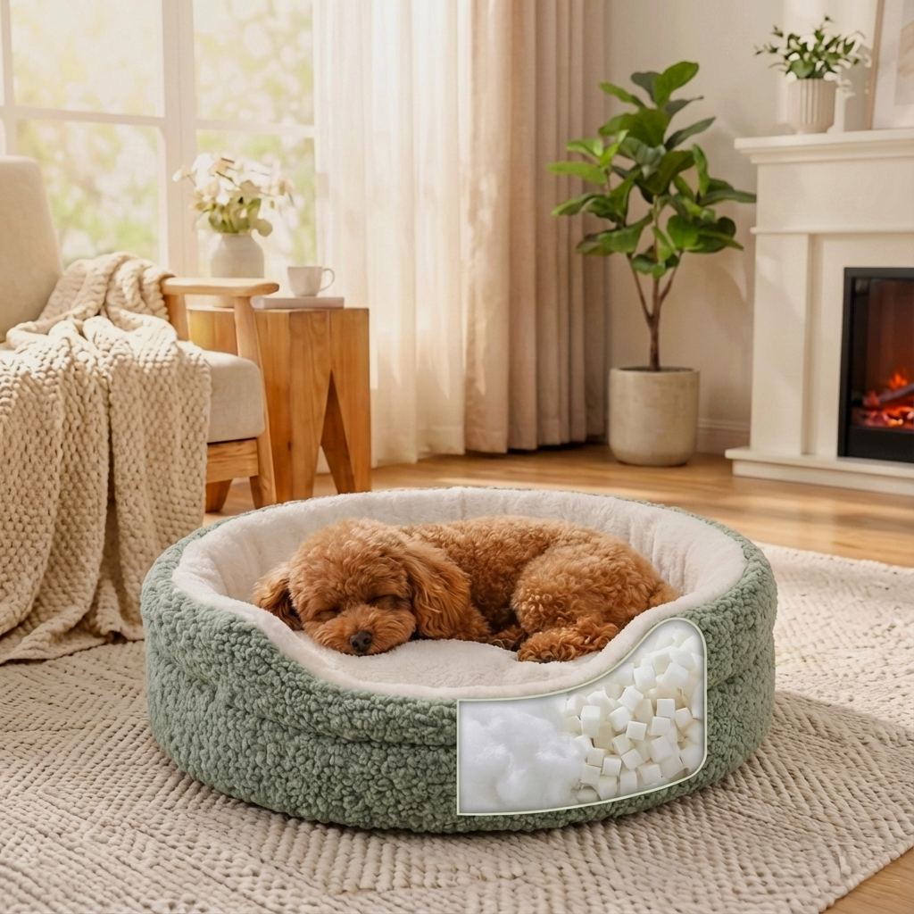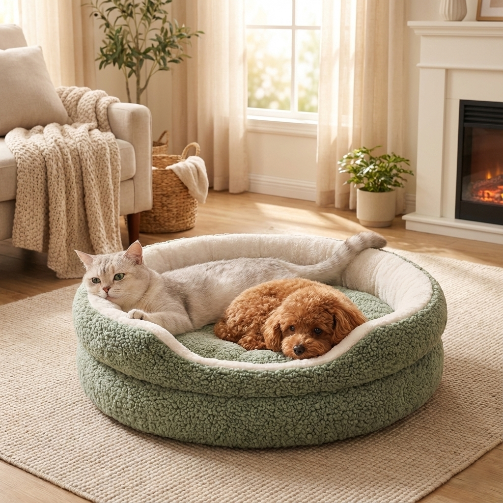 The Cozy Cloud Pet Bed comes in a universal "Snuggle Size," measuring 23 inches (58cm) in diameter and 7 inches (18cm) in height. It is specifically designed for small breeds and cats who love to curl up.